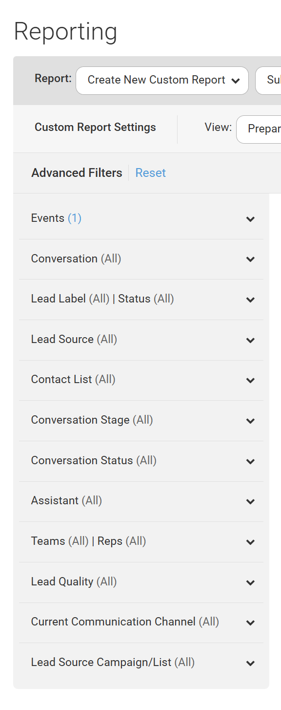 - Filters: Filter out leads who do not meet specific criteria. For example, by filtering to a single conversation you can report on metrics for only those leads who were assigned to that conversation.