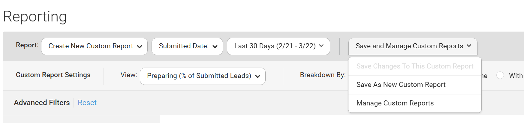 - Select Custom Reports from the drop-down menu. This will automatically take you to the last custom report you've viewed.