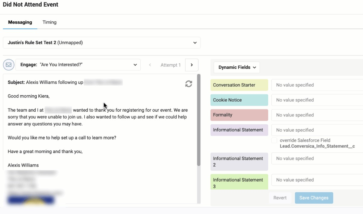 Edit a conversation’s dynamic fields to tailor your message for a specific audience and product/services. When you fill in these variables and create multiple versions for each field type, you are customizing your communications and further personalizing how you interact with prospects and customers.