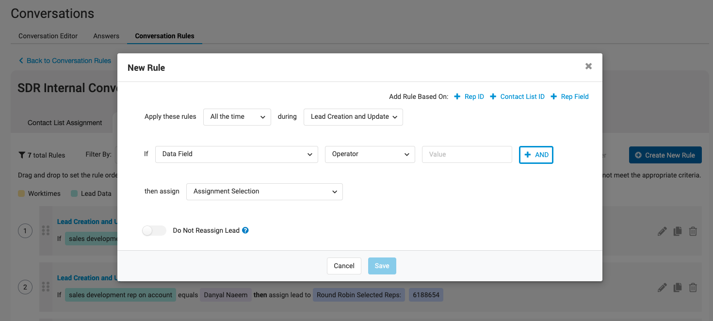 Streamline your Sales lead management process with Rep Assignment Rules, an upcoming feature under Conversation Rules that enables you to create rules that efficiently route leads. So when Conversica moves into lead creation or lead update mode, it examines these defined rules and automatically assigns the lead to the most appropriate rep.