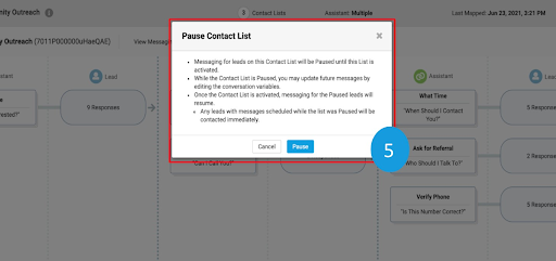 Step 5: The Pause Contact List confirmation screen will appear. Click Pause to confirm your request.