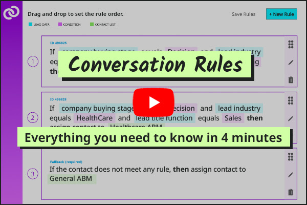 Conversation Rules is an essential Conversica feature that segments your leads and assigns them to the appropriate conversation, rep, or status. You create “Rules” to automatically route your leads based on conditions and logic from your CRM or MAP.