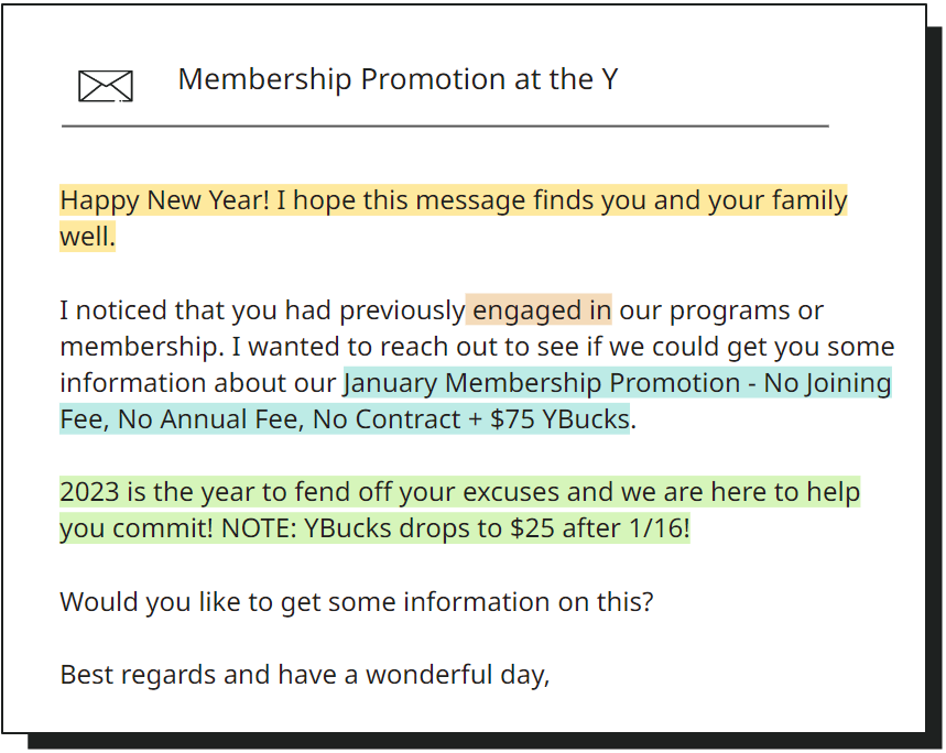 One YMCA celebrates the New Year with an enticing January Membership Promotion. This campaign ran at the start of 2023 and resulted in 5.48% Conversation Rate and 3.27% Conversation Qualified Rate.