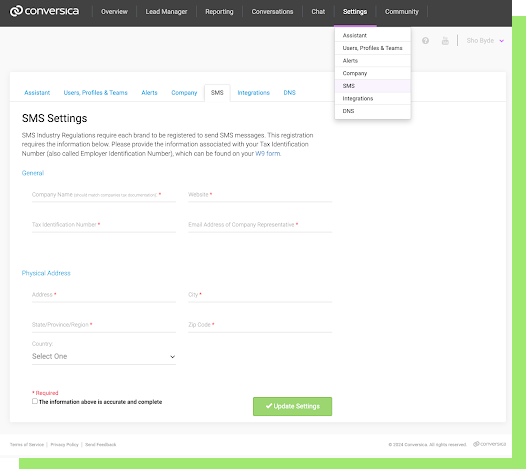 If you're a Conversica Admin, please take a moment to check out your SMS settings to make sure all required information is filled out!