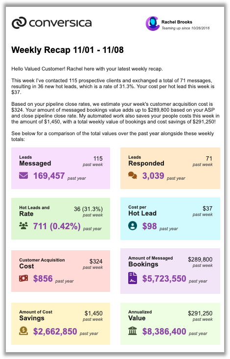 We’re excited to announce the release of the Weekly ROI Summary Report, a powerful new report designed to give you a clear, in-depth view of the value Conversica delivers to your business. This report highlights key metrics such as cost savings, customer acquisition costs, lead engagement rates, and more, helping you see the tangible benefits of our solutions.