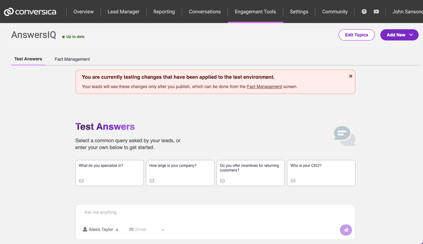 Head to Engagement Tools > AnswersIQ, and click the Test Answers tab.